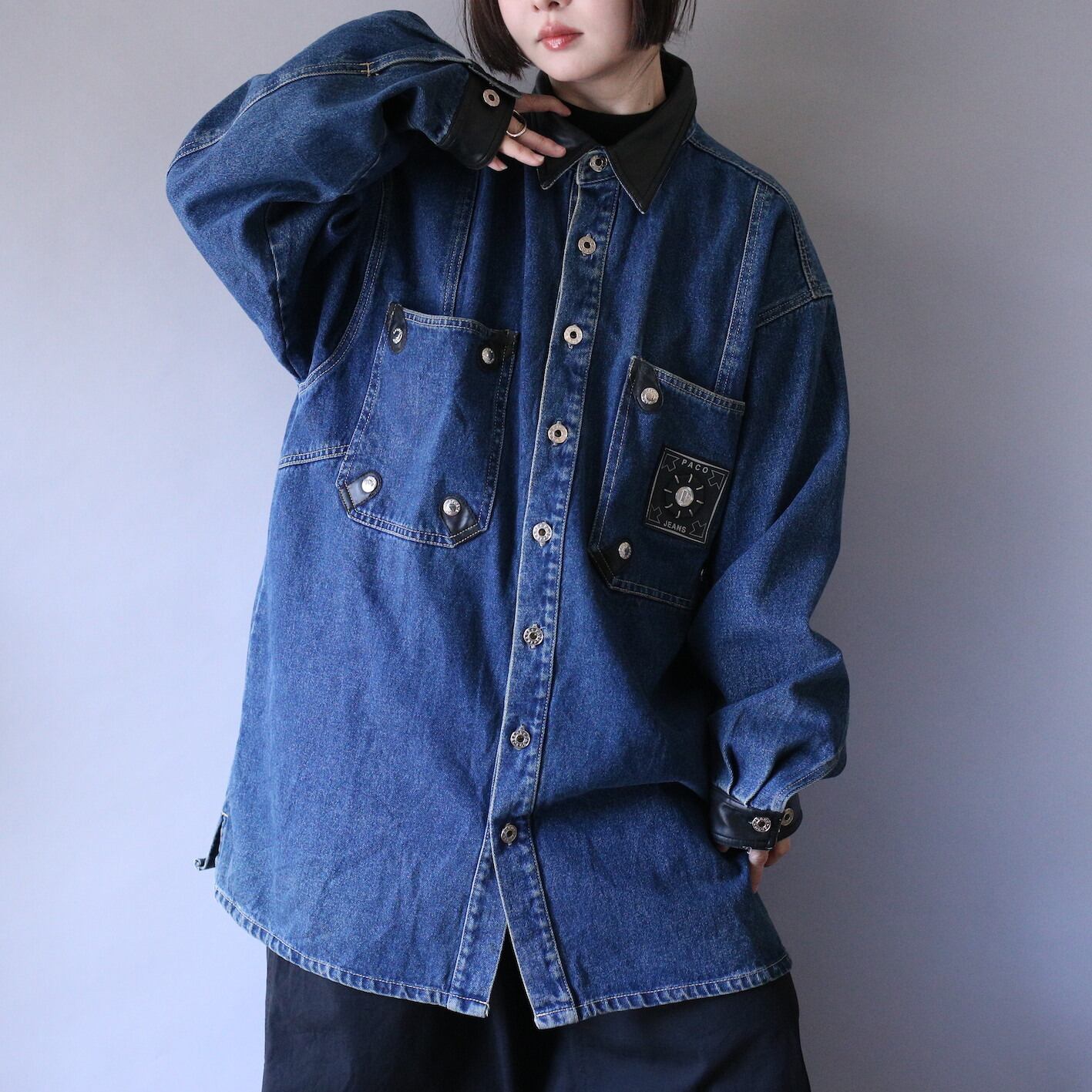 デニムジャケットにフェイクレザーの切り替えや大量のスナップボタン、胸ポケットと背中には今っぽいテック感ムンムンの装飾付きと”唯一無二”な逸品掘り出してきました◎